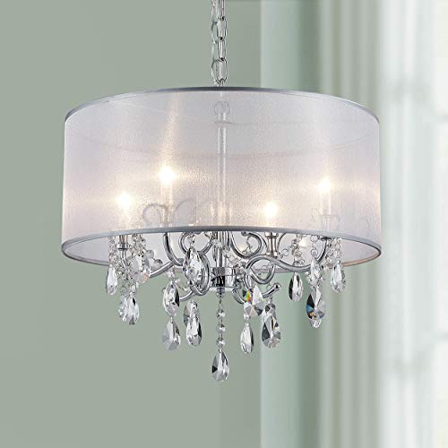 - This elegant crystal chandelier features a sculptural antique silver frame behind a sheer organza shade.