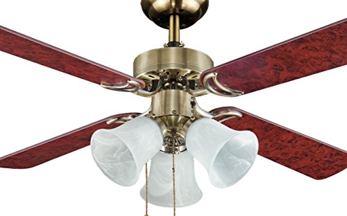 This beautiful fan brings traditional elegance to your decor. The gorgeous patchy brown 42″ brown blades and glass lights will capture your attention. This fan is reversible for winter and summer usage. It comes with a free remote and free shipping. has a stunning look with an antique brass body. its quiet operation is very soothing. It is very pretty and elegant. The height of the fan from the ceiling to the lights is 13.5 inches and the length of the downrod is 4 inches. This fan will require 3 (E27) bulbs with a total wattage of 150
