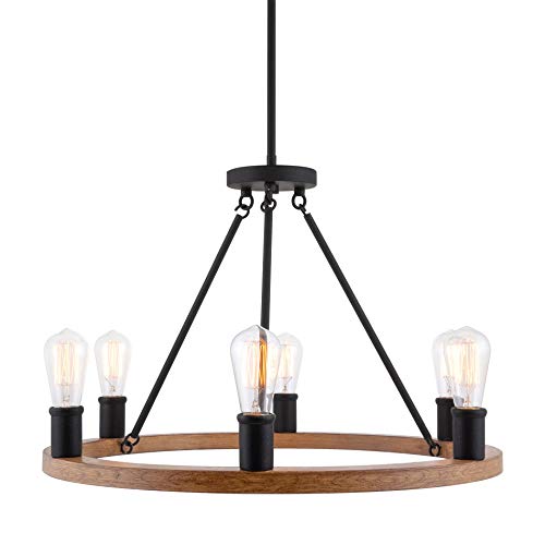 Kira Home Jericho 25″ 6-Light Large Rustic Farmhouse Wagon Wheel Chandelier, Round Kitchen Island Light, Textured Black Accents + Wood Style Finish