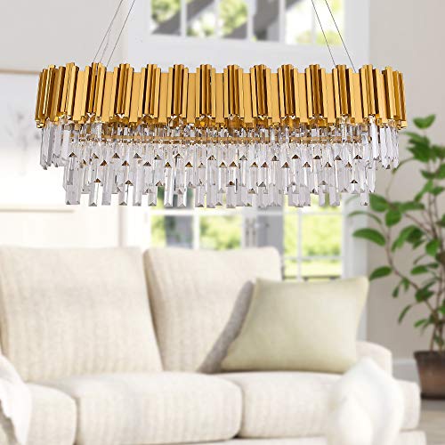 MEELIGHTING W35″ Linear Modern Crystal Chandelier Lights Luxury Pendant Ceiling Light Oval Raindrop Contemporary Chandeliers Lighting Fixture for Dining Living Room Kitchen Island Bedroom Gold