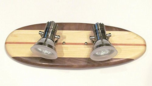 Time to update those old vanity lights with this ever so cool surfboard light. Use it as a vanity light or a bar light and it will certainly add that surfer touch you’ve been looking for. Beautifully crafted longboard made of layered walnut, poplar and a cherry stringer. The board comes with 2 decorative satin nickel studio heads by Eurofase with GU-10 50 Watt Bulbs. The surfboard measures 18″ long by 6″ wide. Bulbs, hardware and instructions are included. Some basic wiring skills are needed for installation. Installs like a light fixture.