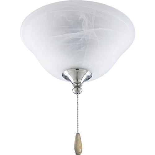 Elegant alabaster glass ceiling fan light conceals light bulbs and casts an inviting illumination in any size room. Energy saving compact fluorescent light source is a great benefit with this fixture. Corresponding pull chain features Chrome finish with a white fob. Universal style is good for fans that accept an accessory light. Brushed Nickel finish.