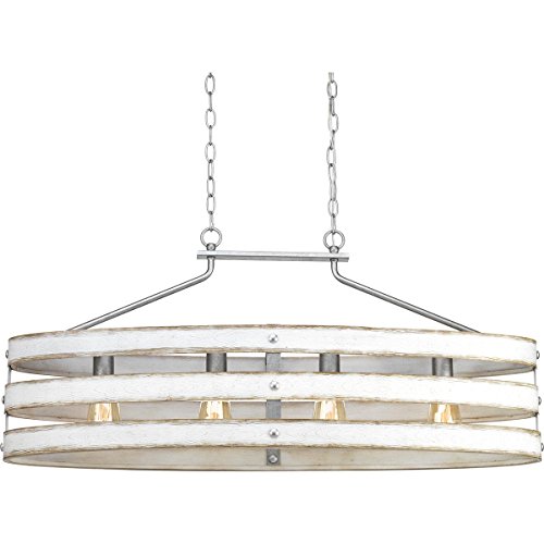 Select the perfect farmhouse home décor with the Gulliver Collection’s Four-Light Linear Chandelier. Bask under the cozy country glow of the light bases arranged in linear fashion at the light fixture’s center ready to hold generous light sources. Three circular bands wrap together to create an open-design similar to rustic country baskets. The frame features a dual-toned color combination of galvanized with antique white accents. For ideal illumination, the linear chandelier uses four medium base bulbs that are sold separately (75w max – LED, CFL, halogen, or incandescent). Incorporate clear light bulbs for a pinch of contemporary shine or opt for vintage bulbs to enhance the light fixture’s antique demeanor. With the ability to be fully dimmable with dimmable bulbs, the light fixture offers endless versatility when it comes to finding a place in your home décor vision. The light fixture’s organic farmhouse look is ideal for any hallway, foyer, great room, or dining room in farmhouse, urban industrial, or coastal setting. It’s time to breathe new life into the mundane every day with timeless and truly transformative bathroom lighting. Make your purchase today to begin your journey to a whole new lighting experience. Progress Lighting products are designed for exceptional quality, reliability, and functionality.