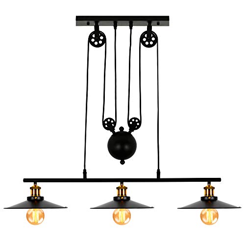 T&A 3-Light Kitchen Island Pulley Pendant Light with Black Metal Finish,Adjustable Industrial Rustic Farmhouse Chandelier for Dining Room Breakfast Bar Pool Table