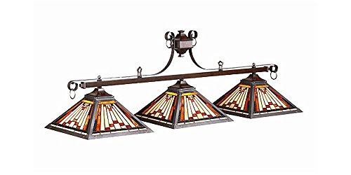 For game room, bar and more, this three-shade light has lots of style. Pyramid shaped shades are made from rich brown, cream and yellow art glass and fashioned in the Arts and Crafts Style. Comes complete with ceiling canopy, electrical wiring and hanging chain. Solid steel design with custom finish and stained glass. Some assembly required. Electrical wiring, hanging chain, and ceiling canopy included. Uses 3 x 100 watt bulbs (not included). Bar Weight: 20 lbs. Shade Weight: 18 lbs. Bar Dimensions: 54.5 in. x 15.5 in. x 6.5 in.. Shade Dimensions: 18 in. x 18 in. x 12 in..
