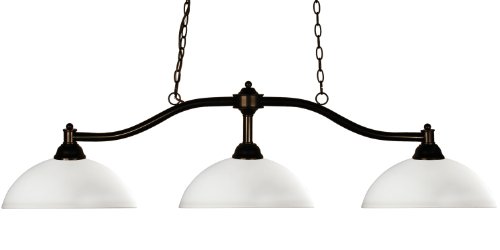 Simple yet versatile detailing defines this beautiful three light fixture. Finished in bronze and paired with dome mottle opal glass shades, this three light fixture would be equally at home in the game room, or anywhere else in the house needing a touch of timeless charm. 72 Inch of chain per side is included to ensure the perfect hanging height.